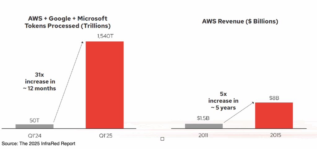 There is an explosive pace of growth in the AI infrastructure cycle compared to the earlier cloud computing wave. From Q1 2024 to Q1 2025, the combined tokens processed by AWS, Google, and Microsoft surged from 50 trillion to 1,540 trillion, a staggering 31x increase in just 12 months. By contrast, AWS revenue grew from $1.5 billion in 2011 to $8 billion in 2015, representing a more measured 5x increase over five years. The comparison makes clear that the AI cycle is scaling at a dramatically faster rate than cloud computing did in its early years, requiring an extraordinary amount of infrastructure buildout to sustain such momentum, an effort that underscores both the unprecedented opportunity and the immense operational challenge at hand.