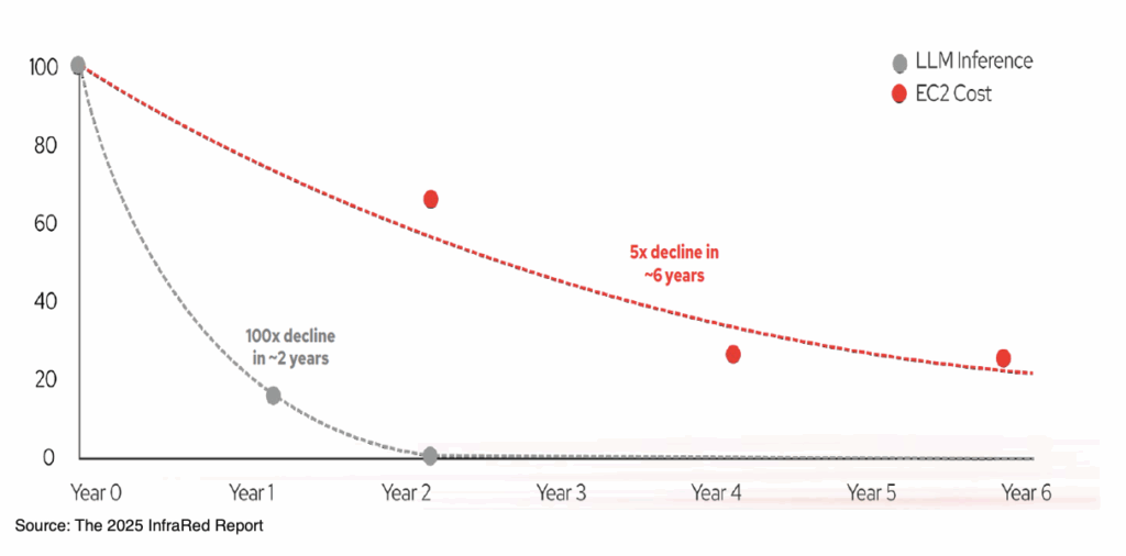 There is a dramatic decline in the indexed cost of LLM inference compared to AWS EC2 costs, highlighting the increasing leverage in infrastructure to deliver higher output at lower costs for AI. Within roughly two years, LLM inference costs fell by 100x, while EC2 costs declined at a steadier pace of about 5x over six years. This stark contrast underscores how quickly AI-specific infrastructure is becoming more efficient, enabling far greater scalability at significantly reduced expenses, resulting in an efficiency curve that is much steeper than traditional cloud compute improvements.