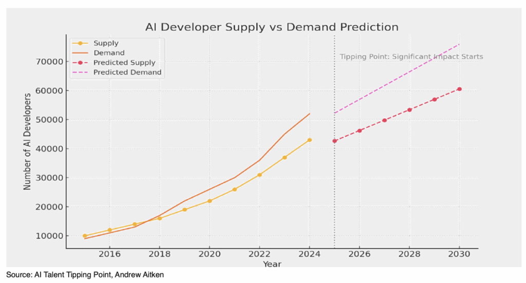The chart illustrates the projected relationship between AI developer supply and demand from 2015 through 2030. From 2015-2024, both supply and demand rose steadily, with demand consistently outpacing supply and the gap widening over time. Projections for 2025-2030 suggest this imbalance will continue, with demand expected to surpass 75,000 AI developers by 2030, while supply will lag at around 60,000. The chart also highlights a “tipping point” around 2025, marking the beginning of a period where the shortage of AI talent is expected to have significant industry impact. Overall, this data underscores the growing structural gap between the demand for AI expertise and the available workforce.