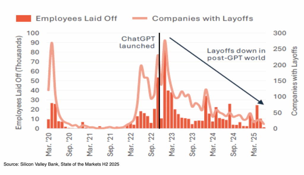 From March 2020 through March 2025, both the number of employees laid off and the number of companies conducting layoffs declined significantly after the launch of ChatGPT in late 2022. The pandemic initially drove massive job losses, followed by another surge in 2022–2023. Yet, the post-GPT era reflects a steady reduction in workforce cuts. This trend demonstrates that AI adoption thus far, has not replaced workers. More importantly, AI is not only preserving jobs but also fostering the creation of better opportunities across industries facing labor shortages. This shift supports higher-value, skill-oriented work and lays the foundation for sustainable economic growth and stronger long-term competitiveness.